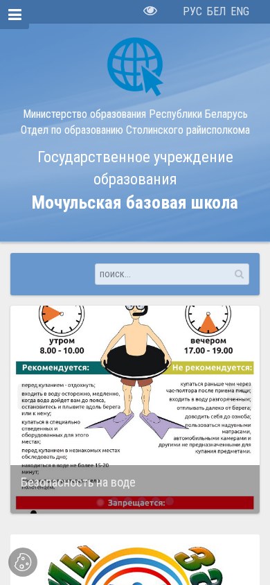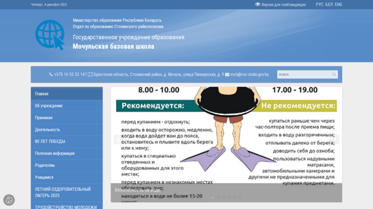 | AI-анализ | This online resource belongs to the Moчульская базовая школа (Mochul' Base School) in the Sтолинский район (Stolin District) of Брестская область (Brest Oblast) in Belarus. The website provides information about the school, its events, and news. Key topics include safety rules, education, work, and prevention of violence. The school's chat-bot is featured, along with information about various days of significance, such as the Day of Unity of the Belarusian and Russian peoples, World No Tobacco Day, and the International Day of Memory for those who have died from AIDS. The school also shares news from the region and sector, and offers resources for students, such as a knowledge marathon, a teachers' union, and various educational organizations. The website is managed by the Ministry of Education of the Republic of Belarus and the |