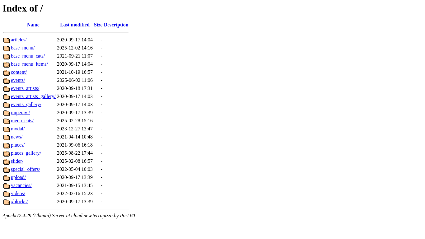 | AI-анализ | This online resource is a website, operated under the .BY domain (Belarus), with a title of "Index of /" and a description that is empty. The keywords associated with the site include "menu," "events," "base," "gallery," "artists," "places," "name," "last," "modified," "size," "description," "articles," "2020-09-17," "2025-12-02," "2021-09-21," "items," "content," "2021-10-19." The site structure consists of various folders and files such as "articles," "base_menu," "base_menu_cats," "base_menu_items," "content," "events," "events_artists," "events_artists_gallery," |