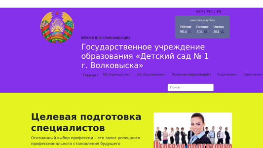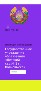 | AI-анализ | The web project "Главная - Государственное учреждение образования “Детский сад № 1 г. Волковыска”" is a Belarusian government educational institution website for a kindergarten located in Volkovysk. The site is available in Belarusian, Russian, and English languages. It provides information about the kindergarten, including its structure, management, contacts, and licensing. The site also features sections on the history of the kindergarten, its achievements, and various policies and documents related to its operations. Additionally, there is information on the enrollment process, meal plans, and safety measures for children. The site also includes interactive maps of kindergartens in Grodno and the surrounding area, as well as various multimedia content from the Emergency Situations Ministry. Overall, the website aims to provide comprehensive information and resources for parents and guard |