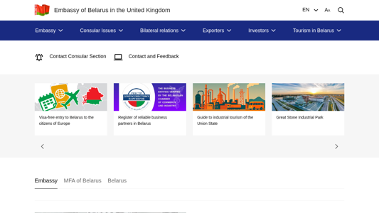 | AI-анализ | This online resource is the official website of the Embassy of the Republic of Belarus to the United Kingdom of Great Britain and Northern Ireland. The website provides comprehensive information on the embassy's address and working hours, history, consular issues, COVID-19, consular service, visa-free travel, visa application process, visa fees, medical insurance, and Belarusian visa upon arrival. Additionally, the website offers useful information for foreigners staying in Belarus, including online registration, border crossing rules, and transit through Belarus. The website also covers bilateral relations between Belarus and the United Kingdom, political dialogue, trade and investment cooperation, humanitarian projects, education in Belarus, Belarusian exporters, and investment opportunities in Belarus. The domain is registered under .BY extension and is available in English and Russian languages. |