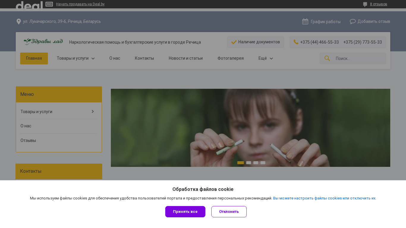 | AI-анализ | This online resource, registered as "ООО "Здравы лад" (OOO "Здравы лад"), is a Belarusian business located at ul. Luначаrskogo, 39-6, in Rechitsa, offering narcological help and accounting services. Established in 2014, it holds a license from the Ministry of Health of Belarus to practice medicine in the field of narcology. The organization provides anonymous narcological help, including alcohol detoxification, and also offers car repair services. The website contains news articles, a photo gallery, and certificates. OOO "Здравы лад" specializes in medical services for narcology and pre-ride vehicle inspections for drivers. The narcological help is provided by a doctor of the highest qualification, and the alcohol detoxification process is |