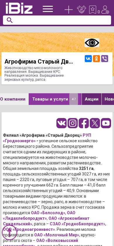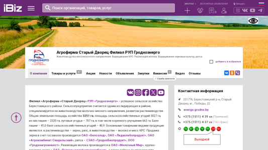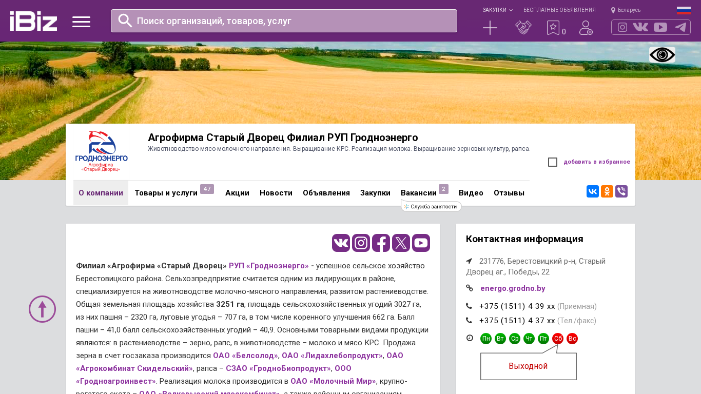 | AI-анализ | The web project "Agrofirm Staryy Dworets Filial RUP Grodnoenergo - Livestock and Dairy Farming" is a Belarusian agricultural business focusing on livestock and dairy farming, cereal and rapeseed cultivation. The company, located in the village of Staryy Dworets, Brest region, occupies a total area of 3251 hectares, of which 3027 hectares are used for agricultural purposes, including 2320 hectares of arable land and 707 hectares of pasture. The farm specializes in milk and meat production from cattle, and crops include cereals and rapeseed. Major buyers for grain are OAO 'Belsołod', OAO 'Lidachleboproduct', and OAO 'A |