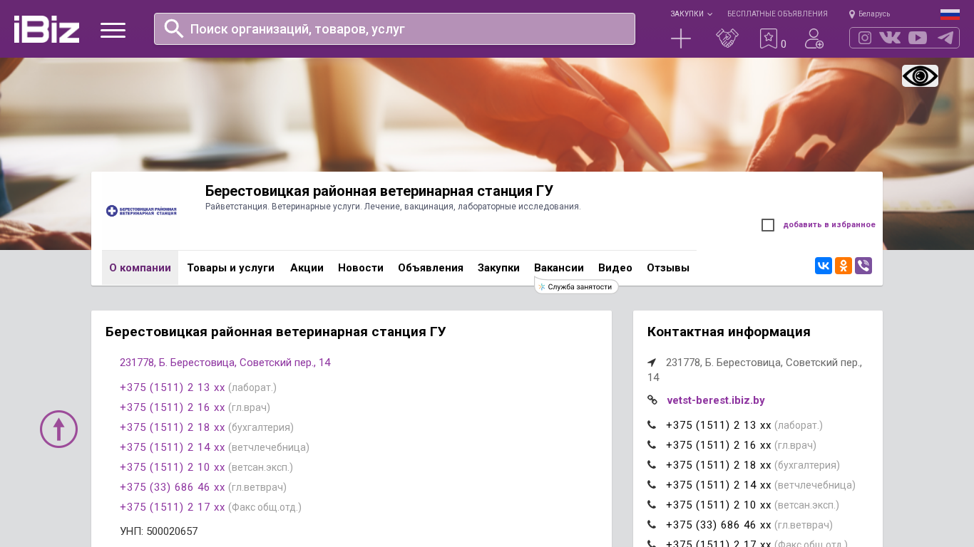 | AI-анализ | This online resource is a veterinary station website named Берестовицкая районная ветеринарная станция ГУ - Райветстанция. It offers veterinary services including treatment, vaccination, and laboratory tests for animals. The contact information, address, and map for reaching the station are provided. The website also includes sections for company information, products and services, veterinary services, news, announcements, vacancies, videos, and customer reviews. The company's Unified State Register number is 500020657. The operating hours are Monday to Friday from 9:00 AM to 6:00 PM without lunch breaks, and the station is closed on Saturdays and Sundays. The contact details include several phone numbers and a fax number. The website is in the 'Ветеринарные услуги, уход за животными' category |