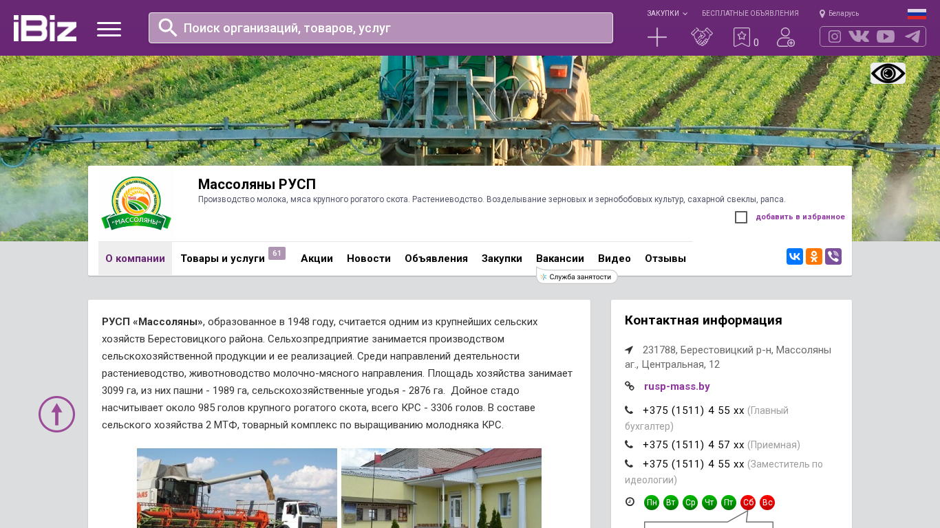 | Название / Заголовок | Массоляны РУСП - Производство молока, мяса крупного рогатого скота. Растениеводство. Возделывание зерновых и зернобобовых культур, сахарной свеклы, рапса.. 231788, , Массоляны аг., Центральная, 12 |
