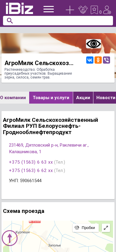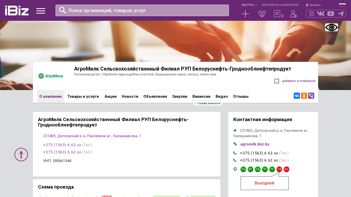 | AI-анализ | The website is a branch of RUP Belarusneft-Grodnooblnefteprodkt for agricultural production named AgroMilk. The branch specializes in agriculture, including the processing of private plots and the cultivation of grain, silage, and seed crops. The website provides contact information and a map for reaching the company located in the Dятловsky district, Raakleviichi village, Kalschnikova 1. The business hours are from 9:00 AM to 6:00 PM, Monday through Friday, with Saturdays and Sundays being holidays. The website features sections for company information, products and services, news, and contact details. |