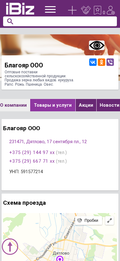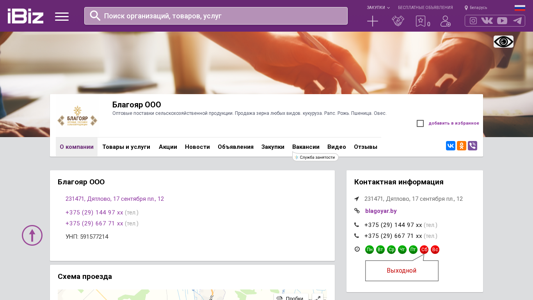 | Название / Заголовок | Благояр ООО - Оптовые поставки сельскохозяйственной продукции. Продажа зерна любых видов. кукуруза. Рапс. Рожь. Пшеница. Овес.. 231471, Дятлово, , 17 сентября пл., 12 |
