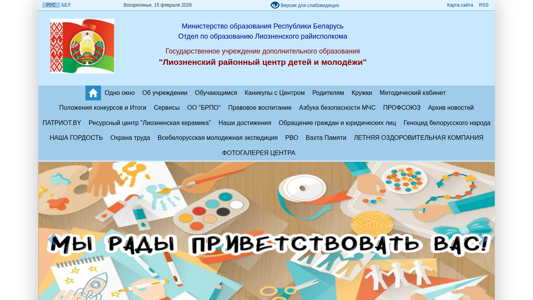 | AI-анализ | This website is the official site for the Liozensky District Center for Children and Youth in Belarus. The title is "Лиозненский районный центр детей и молодёжи" (Liozenskij rajonnyj tsentr detej i molodezhi). The description includes information about the center's schedule, services, and educational programs for children and young adults. Keywords related to the center's activities include "график" (schedule), "детей" (children), "каникулы" (vacations), "районный" (district), "центр" (center), and "молод" (young). The top_words indicate that the website receives significant traffic related to the year 2026 and the words "читать" (read), "далее" (further), and |