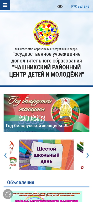 | AI-анализ | This online resource is the official website of the "Чашникский районный центр детей и молодёжи" (Chashniksky District Center for Children and Youth) located in the town of Chašnikis, Vitsebsk region, Belarus. The website provides information about the center's activities, news, administrative structure, pedagogical staff, and various educational programs for children and youth. Key topics include admission information for the 2025/2026 academic year, plans and schedules for the year, month, and vacation periods, and a registry of achievements from previous academic years. The website also features information on safety measures, help resources, and various projects, including an information-patriotic project, a creative project, and a regional support scheme. Additionally, the site includes sections on pedagogical work, methodology, and various documents, as well as announce |