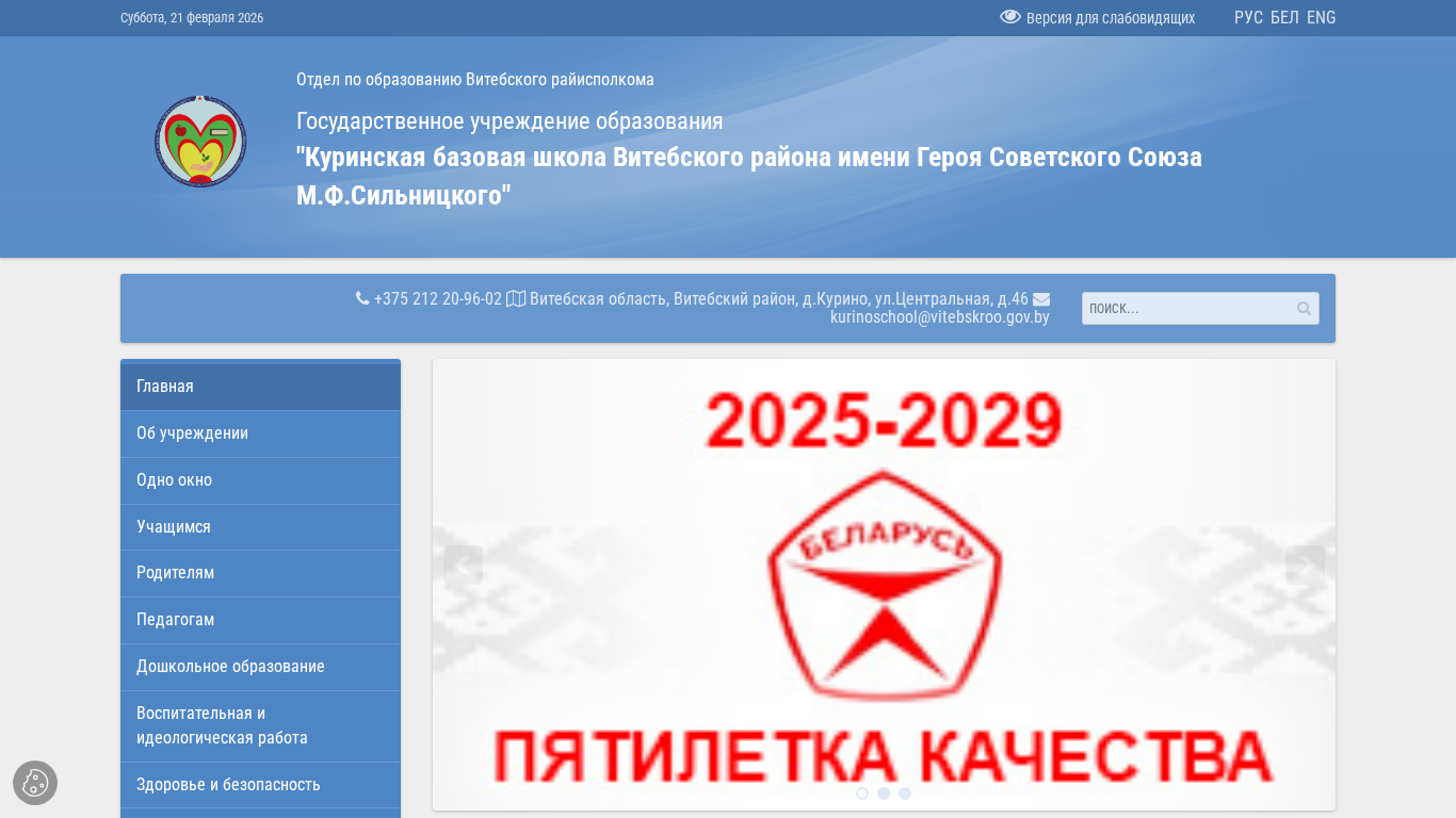 | AI-анализ | --- The website is for the "Kurinская базовая школа Витебского района имени Героя Советского Союза М.Ф.Сiльницкого" or "Kurino Basic School of Vitebsk Region" located in the village of Kurino, Central Street, house 46, in the Vitebsk region of Belarus. The website provides information on the school, its events, news, educational programs, and contact details. Keywords associated with the website include 'Kurinская', 'базовая', 'школа', 'Витебского', 'района', 'образования', 'родителей', 'детей', 'расписание', and 'Витебская'. The website also mentions the payment for educational materials in the 2025/2026 academic year, social |