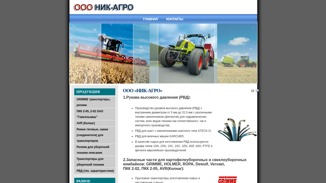 This online resource, titled "ООО «НИК-АГRO»," is a leading supplier of transport vehicles, rollers, RVD (Rubber Vacuum Drives), fittings, and high-pressure hoses in Belarus. The website provides information about GRIMME transport vehicles and rollers, PKK 2-05 and 2-02, OAO "Гомсельмаш" AVR (Kolnag) hoses and fittings, and spare parts for various uptake and uboorochny (harvesting) machinery including Grimme, Holmer, Ropa, Dewulf, Vervaet, and PKK 2-02, 2-05, AVR (Kolnag). The resource also offers repair and restoration services for pneumatic transport systems