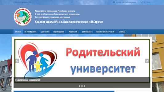 | AI-анализ | This website is for Middle School No. 1 in the town of Beshenkovichi, named after I.I. Strochko, under the Ministry of Education of the Republic of Belarus and the Beleshkovich Regional Executive Committee. The website includes information about the accreditation, educational network, leadership, and functions of the school. It provides schedules, information on engineering classes, and details about the educational process at home. The website also features an administrative schedule, transportation for students, an engineering and technical center, and information on achievements, local creative projects, and the school's STEAM laboratory. The website addresses special education, vocational education, and school cafeteria plans. It includes a library, media center, electronic learning tools, a school council, job openings, labor safety, humanitarian cooperation, and national education research. The website also includes forms for electronic applications and contact information. The domain |