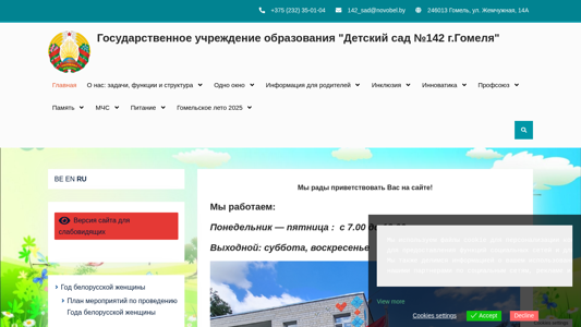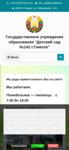| AI-анализ | The web project "Государственное учреждение образования "Детский сад №142 г.Гомеля" (Mail142.by) is a website for a state educational institution, specifically a kindergarten located in the city of Homel, Belarus. The homepage features a menu with sections such as "About Us," "History and Traditions," "Administration," and "Contact Information." The site also includes information for parents, such as hours for meeting with the director and deputy director, and a phone line for emergency psychological assistance. The website provides details on administrative procedures, including relevant laws and application forms, as well as a policy on handling personal data. The site also mentions a parents' council and an inclusion policy, and offers resources for innovation and consultation for both parents and teachers. The kindergarten's phone number and email address are listed |