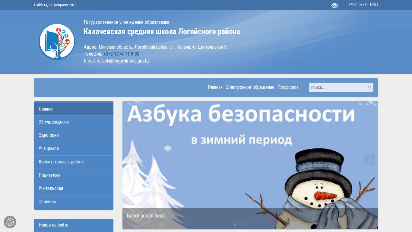 | AI-анализ | This website is for the Калачевская средняя школа (Kalachyvskaya Srednyaya Shkola) in the Lогойsky district of Belarus. The title of the website is "Калачевская средняя школа Логойского района" (Kalachyvskaya Srednyaya Shkola Logoyskogo Rajona). The description includes the address: Минская область, Логойский район, Калачи, ул. Центральная 5, and the contact information: telephone +375 1774 71 8 30, email kalachi@logoysk-edu.gov.by. The website provides information about the educational institution, including the academic year 2025/2026, admission conditions, pedagogical staff, and |