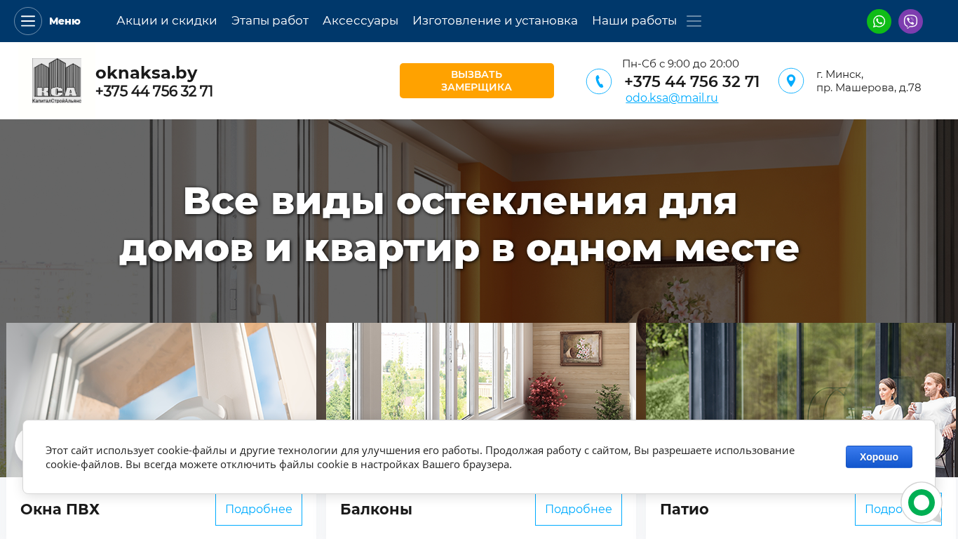 | AI-анализ | The portal oknaksa.by specializes in the production and installation of PVC windows and offers both standard solutions and custom-made windows according to individual designs and dimensions, with the required number of sashes and color profile. The menu includes sections for plastic windows, laminated windows, balconies and loggias, doors, systems for patios, non-standard items, fittings, and accessories, including mosquito nets, skirting boards, and window sills. The company also provides custom-made frames, installation, and offers certifications, a mobile office, and delivery services. The website features a gallery of completed projects, a section for the company's history and production capabilities, and information on guarantees, customer testimonials, and contacts. The website is available in Belarusian and Russian languages, with the main language being Russian. The website's title is "Изго |