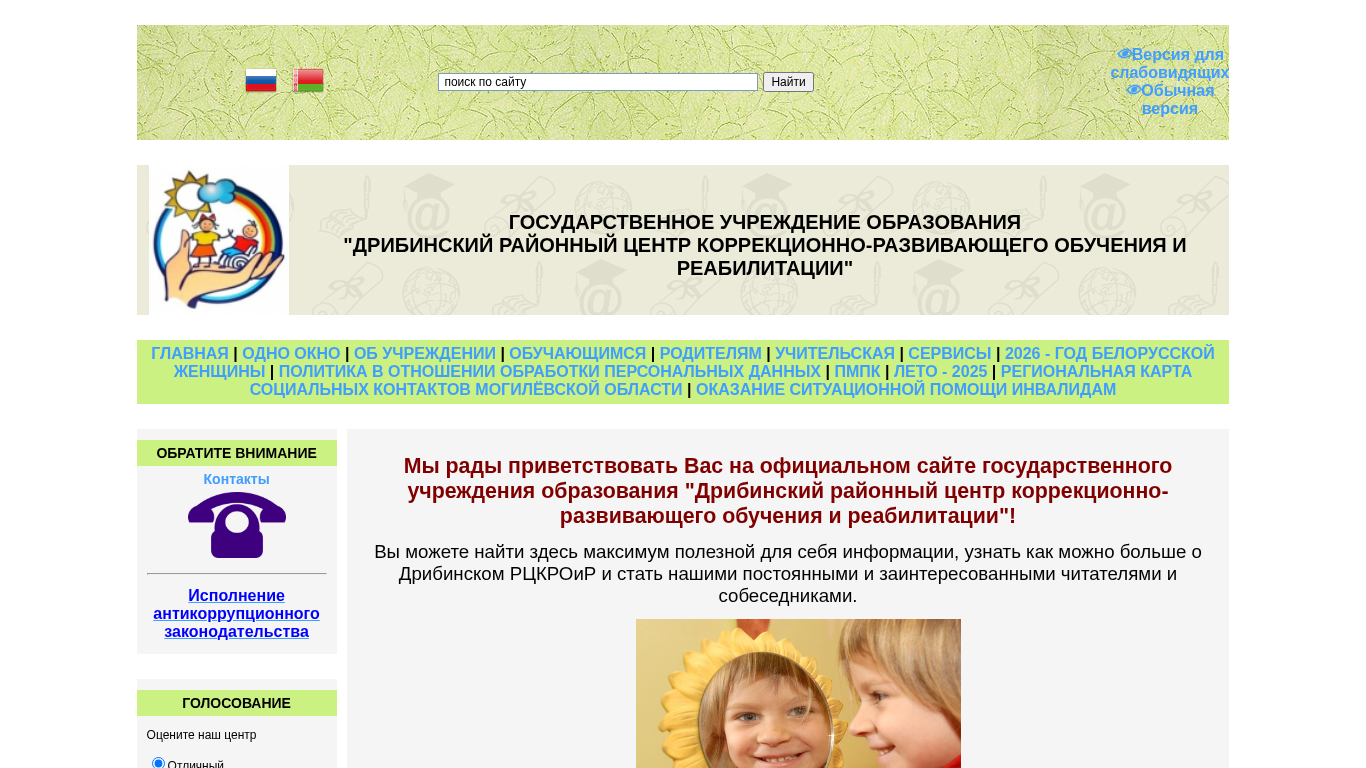 | AI-анализ | The website is the official site of the "Dribin District Correctional-Development Educational and Rehabilitation Centre" in Belarus. It provides information about the centre, its services, and educational programs for children with autism spectrum disorders (ASD). The centre is a government educational institution located in the village of Dribin. It offers consultations for legal guardians of ASD children on the third Wednesday of every month. The contact details include a phone number, email address, and the website address. The centre operates from Monday to Friday, 08:00 to 17:00, and on weekends, 08:00 to 17:00. The director's name is Larisa Prudnikova. The site includes news and announcements. |
