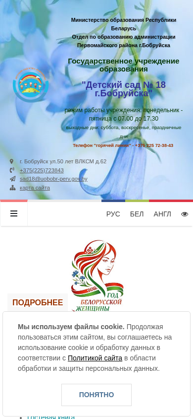 | AI-анализ | The web project "Детский сад № 18 г.Бобруйска" (Children's Kindergarten No. 18 in Bobruisk) is a state educational institution under the Ministry of Education of the Republic of Belarus, located in the First May District of Bobruisk city. The kindergarten operates from Monday to Friday between 07:00 and 17:30, with weekends and holidays being its non-operating days. The contact details include a 'hotline' phone number (+375 225 72-38-43) and an email address (sad18@uobobr-perv.gov.by). The website contains sections for 'One Window' administrative procedures, forms, and a schedule for processing these procedures. It also features information on the kindergarten's administration, |