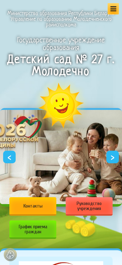 | AI-анализ | The website is a government-run daycare center for children, located in the city of Molodechno, Belarus. The title is "Детский сад № 27 г. Молодечно" (Daycare Center No. 27 in Molodechno). The description contains keywords related to the daycare center's operations, including "учреждения" (institutions), "образования" (education), "безопасность" (safety), and "детей" (children). The top_words list suggests that there is information about the schedule and administration of the daycare center, as well as contacts, electronic application process, and a map. The website also features information on the organization's history, mission, and various educational and support programs. The domain is a Belarusian .BY extension, and the website is operated by the M |