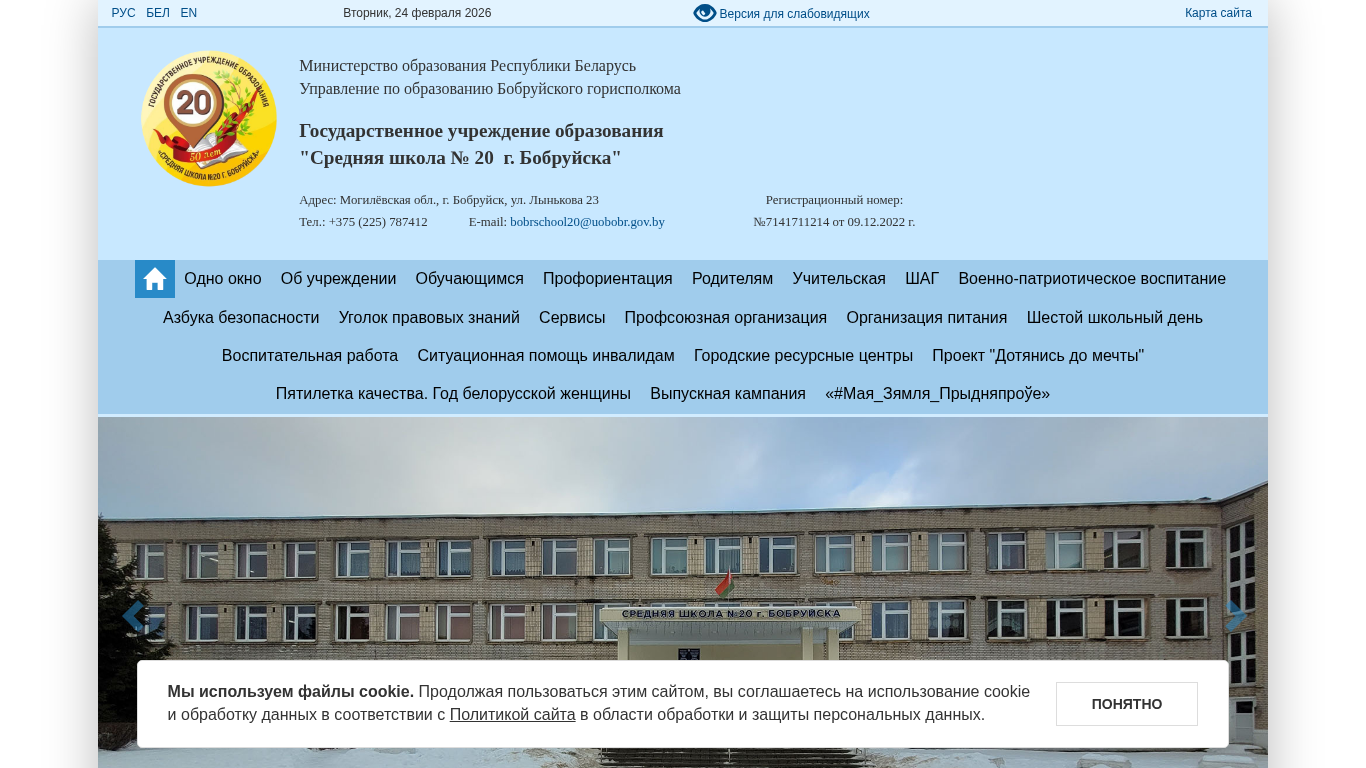 | Адрес | Государственное учреждение образования, "Средняя школа № 20 г. Бобруйска", Адрес: Могилёвская обл., г. Бобруйск, ул. Лынькова 23 |