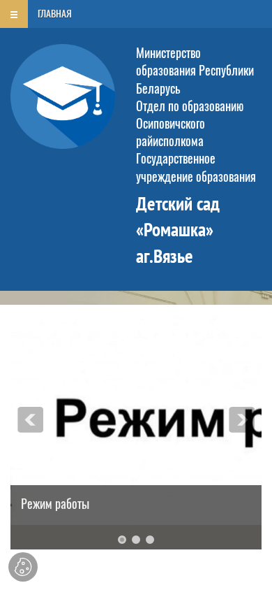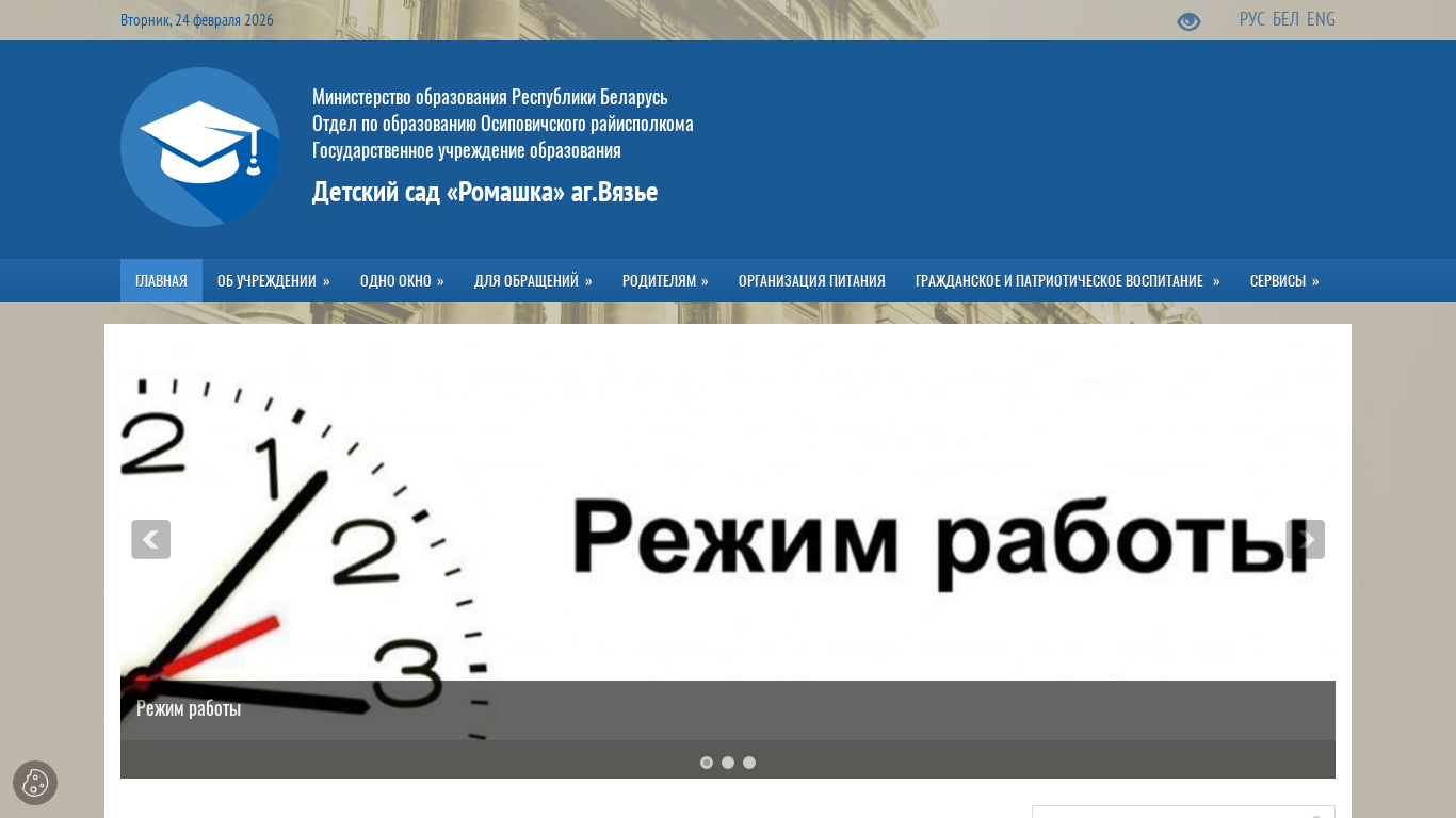 | AI-анализ | --- The website is for the kindergarten "Romaшка" in Vyazye, Belarus. It is run by the Osinovich District Education Department under the Ministry of Education of the Republic of Belarus. The kindergarten's current news, schedule, and contacts are provided, including information about its management, pedagogical staff, and licensing. The website also includes sections on the kindergarten's goals, structure, history, and rules for employees. There is a section dedicated to the 2026 Year of the Belarusian Woman, as well as information about the union and its committees. The website offers information on social partnership, health retreats, and other services. It also provides answers to frequently asked questions for parents, and information on social-pedagogical support and psychological help. The website is governed by various normative legal acts related to administrative procedures |