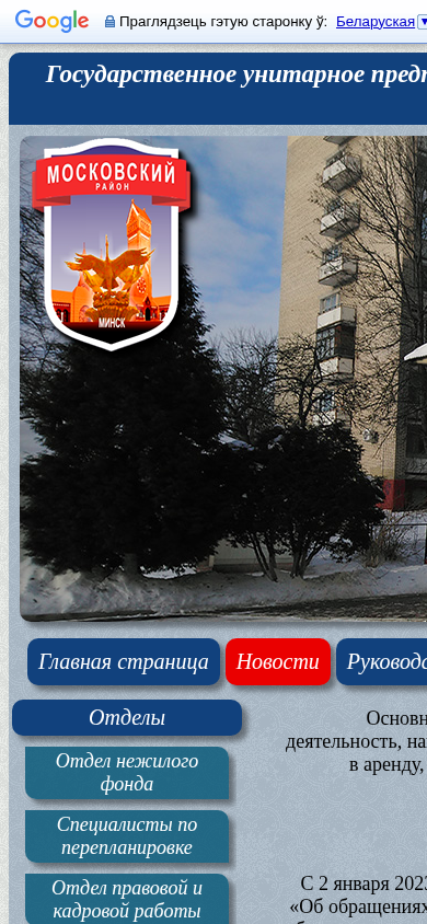 | AI-анализ | This online resource is the homepage of the State Unitary Enterprise "Housing and Utilities Repair and Exploitation Enterprise of Moscow Region in Minsk." The website provides information on the organization's activities, which primarily involve managing and renting out non-residential property, as well as protecting the economic interests of the property owner and generating revenue. As of January 2, 2023, electronic applications from citizens and legal entities can only be submitted through the state unified (integrated) republican information system for the processing of citizens and legal entities' applications. The contact details provided are a reception desk phone number (397-13-38), an email address (jreomos@jreomos.by), and a physical address (220036 Minsk, 2nd Alley of Rosa Luxemburg, 1a). The office is open |