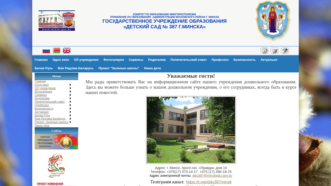 | AI-анализ | The portal <ddu387.minsk.edu.by> is an educational institution website for a kindergarten named 'ДЕТСКИЙ Сад № 387 г. Минска' located in the Moscow district of Minsk, Belarus. The website provides information on the administration's schedule, contact information, and procedures for administrative processes such as registration and application submission. Visitors can find rules and guidelines for pedagogical workers, as well as policies on personal data protection and Cookie usage. The site offers electronic forms for submitting requests and information on services, including social-pedagogical support and psihological help. Additionally, the portal includes a rating evaluation system, a photo gallery, and various educational and informational resources for parents. The kindergarten's mission, history, and founding documents are also accessible on the site. |