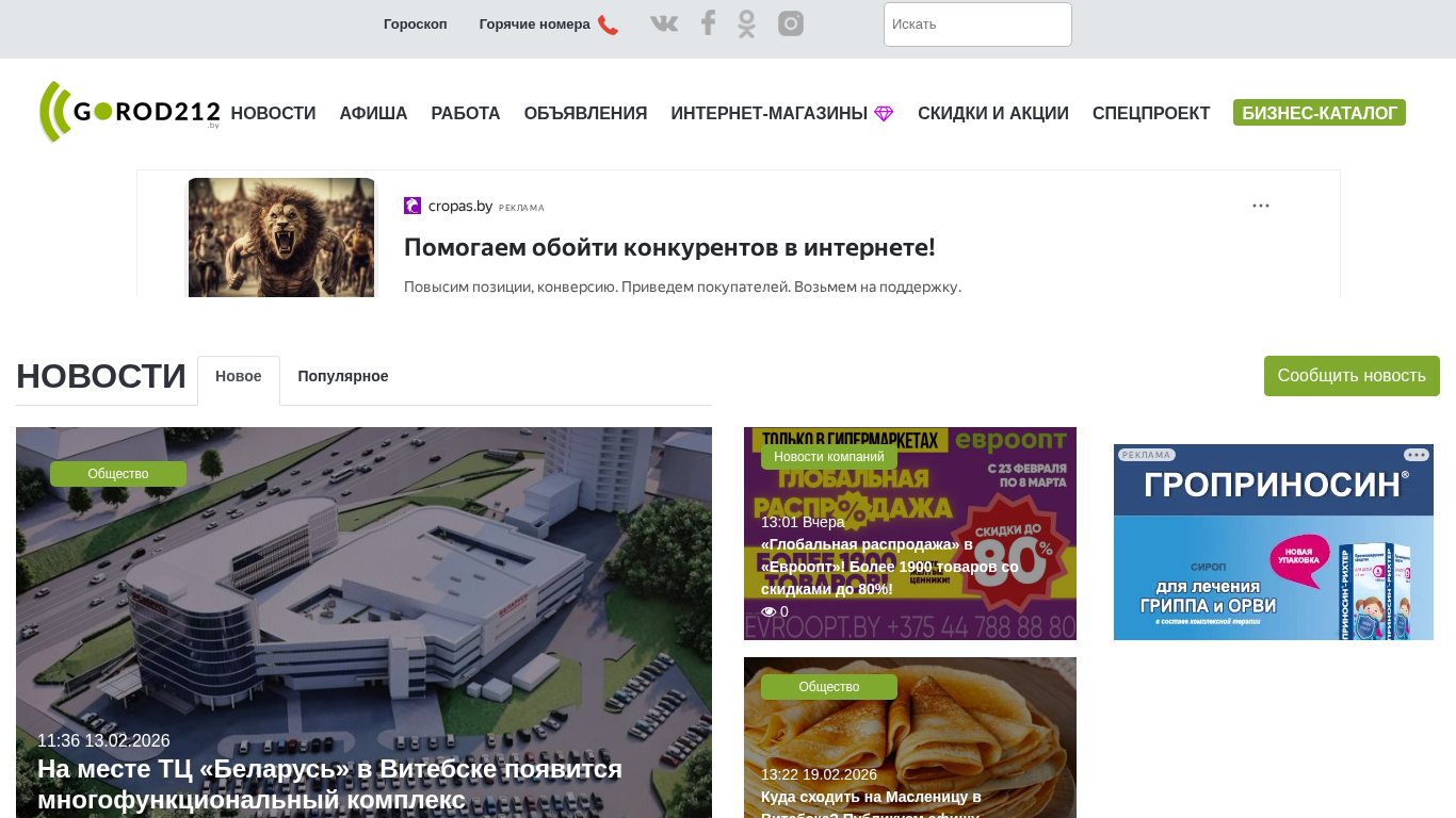 | SEO-описание | Городской портал Витебска. Новости, реклама, объявления, афиша мероприятий, работа, вакансии, резюме, скидки и акции, спецпроекты. Только самые актуальные новости. Прогноз погоды, расписание транспорта, гороскоп всех знаков зодиака на сегодня. экстренные службы и горячие номера, курсы валют. |