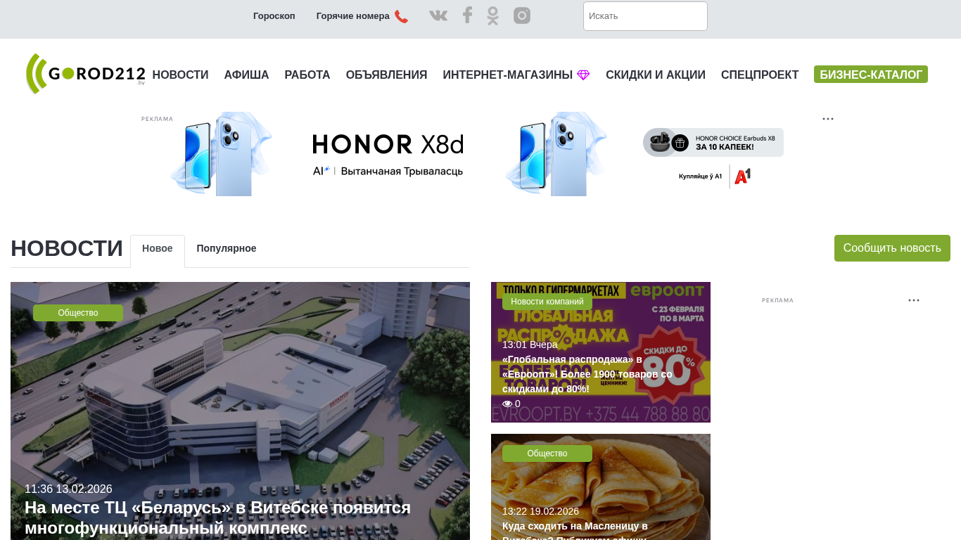| SEO-описание | Городской портал Витебска. Новости, реклама, объявления, афиша мероприятий, работа, вакансии, резюме, скидки и акции, спецпроекты. Только самые актуальные новости. Прогноз погоды, расписание транспорта, гороскоп всех знаков зодиака на сегодня. экстренные службы и горячие номера, курсы валют. |