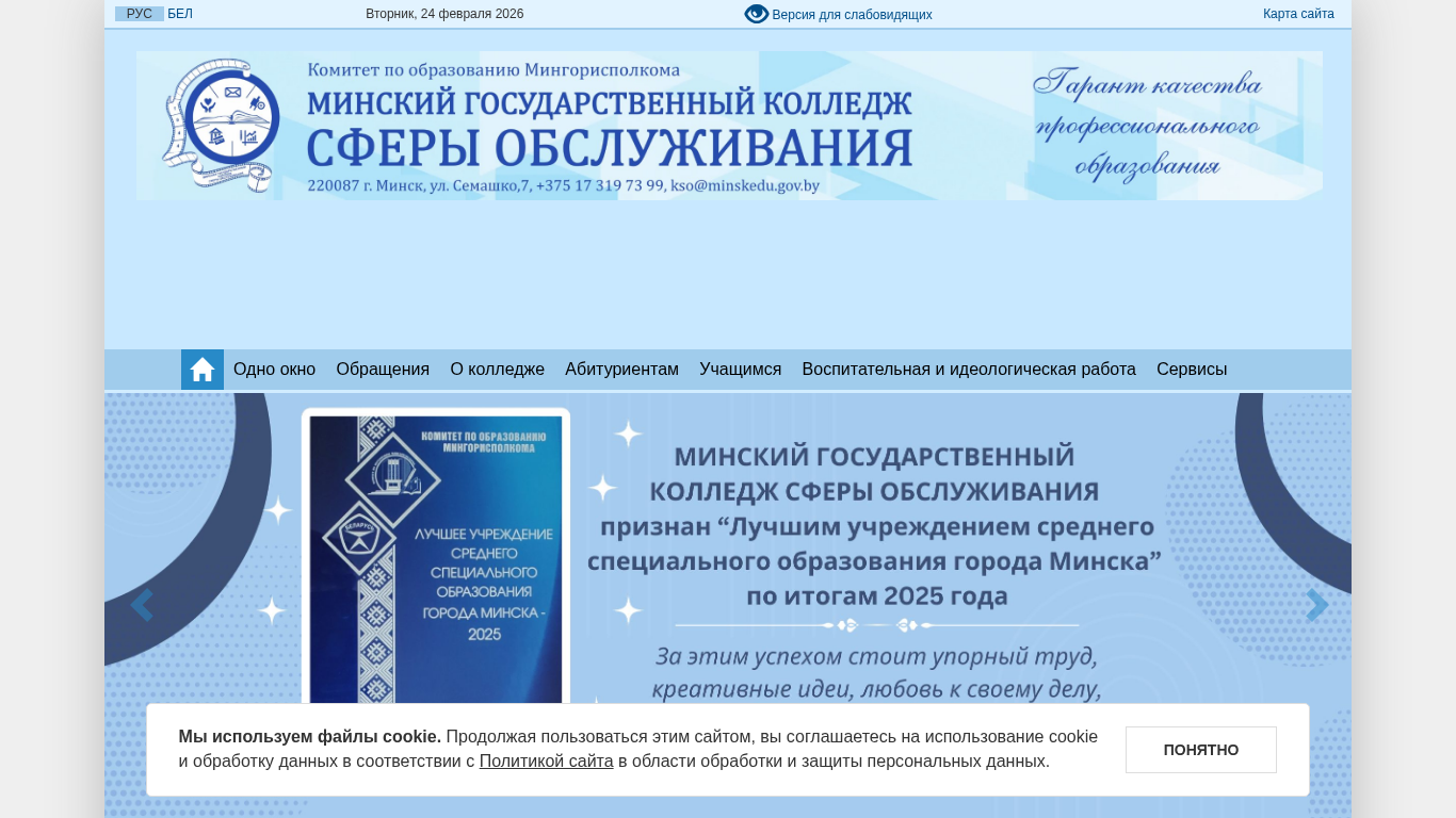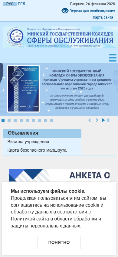 | AI-анализ | This website belongs to the Minsk State College of Service Sector (Минский государственный колледж сферы обслуживания) in Belarus. The college offers various educational programs and services related to different fields of social and professional activity. Users can find information about the college's administration, schedule for citizen reception, normative legal acts, administrative procedures, and paid services. Additionally, the site includes sections for contacts, documents, and a telephone directory. The college's history, goals, and teaching staff are also presented. Specialties covered range from technical and social services to financial and library science. The website also features information on post-graduation opportunities, student responsibilities, and educational schedules. Other services include social work, financial work, and technical device maintenance. The college's portal for rating evaluation allows visitors to ask questions. The site is accessible for people with disabilities and includes sections |