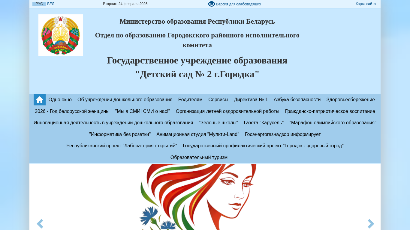 | AI-анализ | --- The website "Детский сад № 2 г.Городка" (Sad2.gorodok.edu.by) is a government educational institution website dedicated to a kindergarten in the city of Gorodka, Belarus. The site primarily focuses on providing information related to kindergarten education, administrative procedures, and contacts. Keywords associated with the website include "образования" (education), "дошкольного" (kindergarten), "помощи" (help), and "безопасность" (safety). The website includes sections on the kindergarten's administration, pedagogical staff, and various policies and procedures. It also features information on enrollment, educational processes, and nutrition. The website is designed with a standard color scheme and uses a single window layout. It is accessible for visually impaired individuals and offers a |