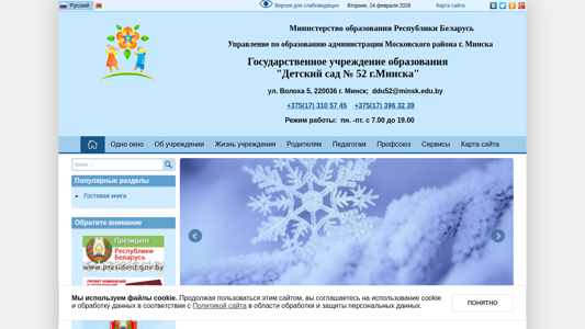 | Адрес | Московского района г. Минска, Государственное учреждение образования, "Детский сад № 52 г. Минска", ул. Волоха 5 |
