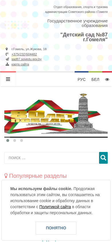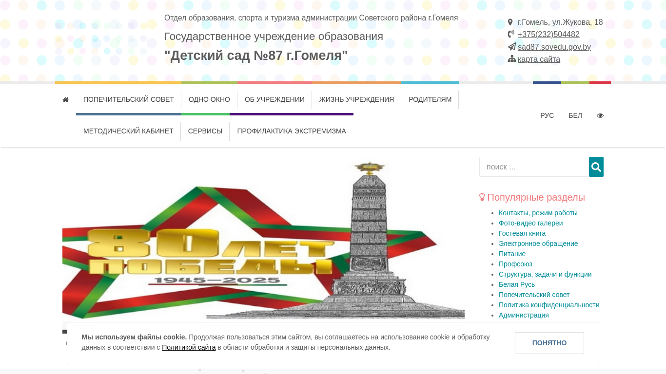 | AI-анализ | --- This online resource belongs to the State Educational Institution "Children's Garden No. 87 of the city of Homel, Belarus." The website is operated by the Education, Sports and Tourism Department of the Soviet District Administration of Homel. The main sections of the site include information about the kindergarten's administration, contact details, a map of the location, a schedule of work and admissions, services of trust, administrative procedures, an electronic application system, popular inquiries, higher authorities' information, and a contact page. The site also features sections on the institution's structure, tasks, and functions, a visitors' book, a news archive, announcements, and a search function. Other sections include information on the kindergarten's conditions of admission, staff, social and psychological services, policies on confidentiality, and various services offered. The site contains photo and video galleries |