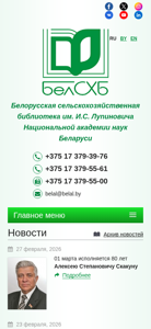 | AI-анализ | The website is the homepage of the Belarusian Agricultural Library of the National Academy of Sciences of Belarus. It serves as an informational hub for agriculture, forestry, food industry, nutrition, and food supply in Belarus. The site offers an electronic catalog, databases, the AgroWeb Belarus navigator, full texts of the journal 'Весцi НАНБ. Серыя аграрных навук', documents from the FAO, journal and magazine lists with table of contents, literature lists for thematic and virtual exhibitions, and the option for electronic document delivery. The website also provides information about the Belarusian Agricultural Library itself. |