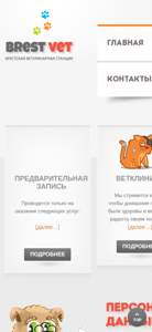 | AI-анализ | --- The web project "Брестская городская ветеринарная станция" is a veterinary clinic in Brest, Belarus. It offers veterinary services and provides contact details. Keywords include 'ветеринарная' (veterinary), 'новости' (news), 'подробнее' (more details), 'тел' (phone), 'контакты' (contacts), and 'далее' (more). The website has sections for 'Ветклиника' (Vetclinic), 'Лаборатории' (Laboratories), 'Аптеки' (Pharmacy), and 'О нас' (About Us). It also features a news section and a personal data policy. The contact information includes phone numbers and addresses for three veterinary clinics in Brest, with operating hours and a fax number. The website |