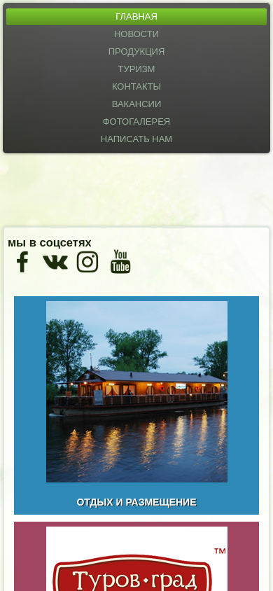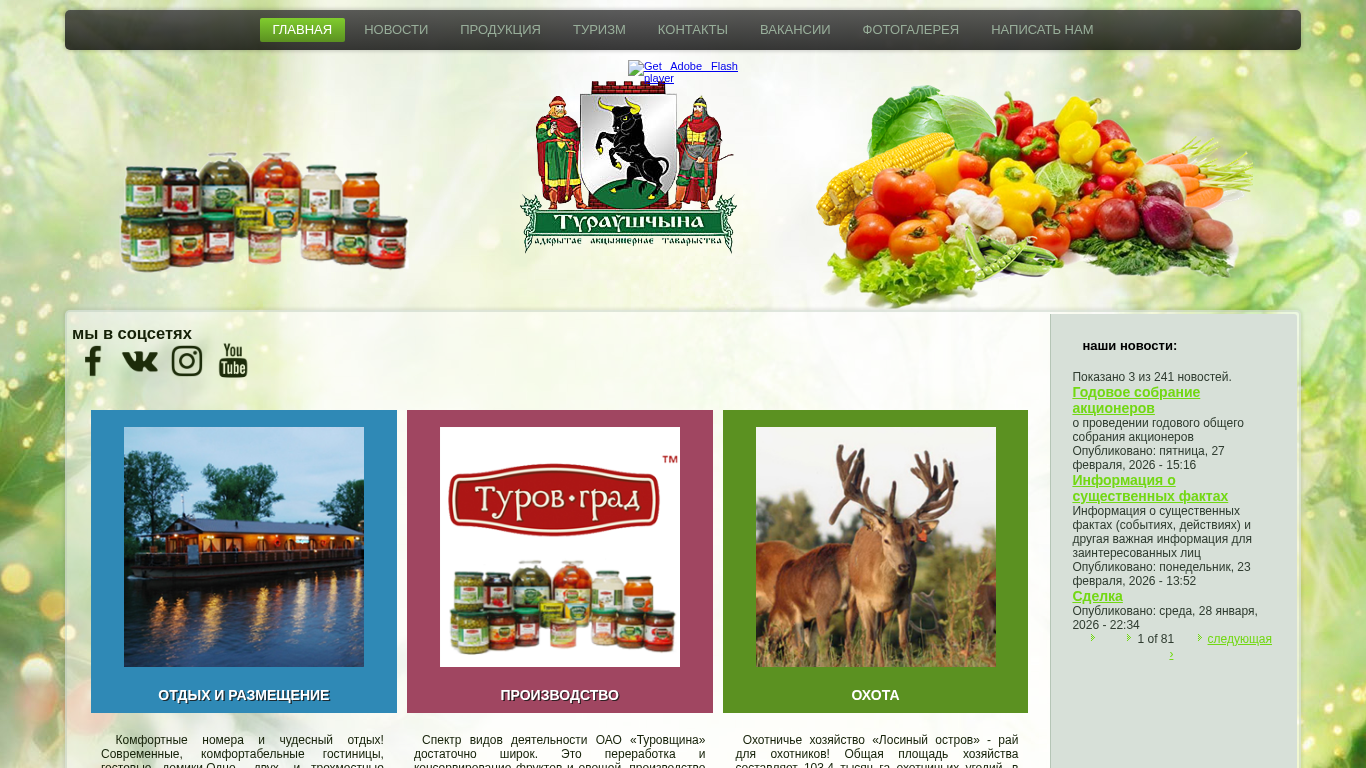 | AI-анализ | This online resource, titled "Главная | ОАО "Туровщина", is the homepage of a large, growing agricultural and tourism company based in Belarus. The site offers extensive information about the company's various activities, including agricultural production, food processing, and tourism services. The main sections of the website include Administration, Union, Vegetable and Fruit Storage, Information for Shareholders, News, and Production. The Production category is further divided into sections for Conserves, Agricultural Products, and Tourism. The company specializes in the production and processing of vegetables, fruits, and milk, as well as the provision of tourism services, such as accommodation, hunting, and recreation. The site features a photo gallery and offers opportunities for booking tours and accommodations online. The agricultural portion of the business covers a wide range of activities, including the cultivation |