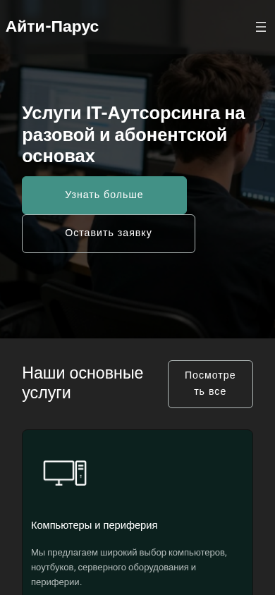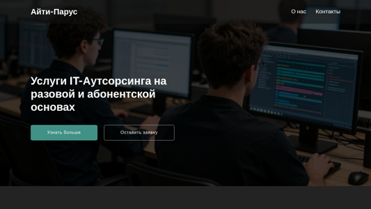 | AI-анализ | This website is for an IT company based in Belarus named Айти-Парус (It Parus). The title of the website is 'Айти-Парус' and the description includes keywords related to IT services, computing equipment, and local networks. The company offers IT outsourcing services on a one-time and subscription basis, as well as sales and support for computers, servers, and peripherals. They also provide installation, maintenance, and administration services for local networks and software, and offer repairs and technical support for computer equipment. The company aims to ensure the reliable, secure, and efficient operation of IT infrastructure for organizations. The website design includes the text 'Aenean vulputate eleifend tellus. Donec elit libero, sodales nec, volutpat a, suscipit non, turpis.' repeated multiple times. The domain is itparus. |