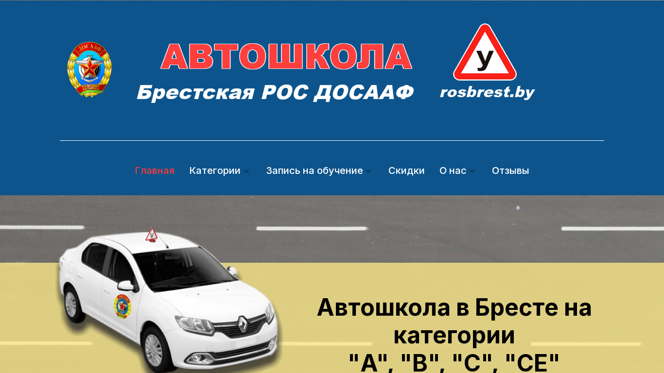 | SEO-описание | Автошкола в Бресте на A, B, C и CE категории. Рос ДОСААФ - лучшие инструкторы, доступные цены и современные учебные автомобили |