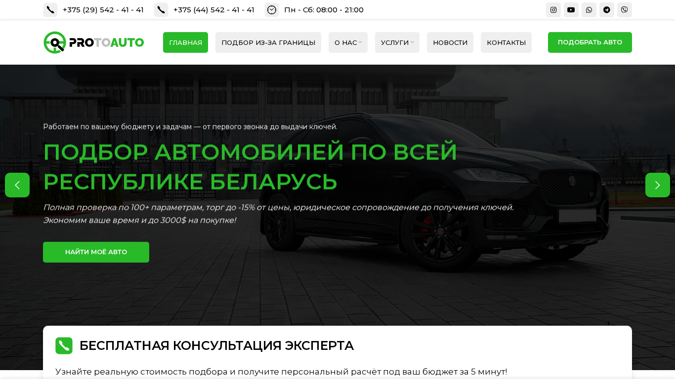 SEO-описаниеПрофессиональный подбор автомобилей в Беларуси. Проверка по 100+ параметрам, торг до -15%, юридическое сопровождение. Подбор авто из США, Европы и Кореи. Звоните!