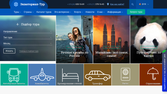 | SEO-описание | ЭКВАТОРИАЛ-тур АДРЕС: 220072 г. Минск, ул. Сурганова, 11, офис 205 (станция метро "Академия наук") КОНТАКТЫ: +375 (17) 378-16-45 +375 (17) 373-56-44 +375 (29) 650-16-69 Skype: equatorial2011 Viber: +375 (29) 650-16-35 WhatsApp: +375 (29) 650-16-35 E-mail: equatorial@bk.ru ГРАФИК РАБОТЫ: Понедельник - пятница: 10:00 - 19:00 Суббота: 11:00 - 16:00 в дежурном режиме на |
