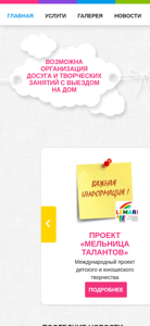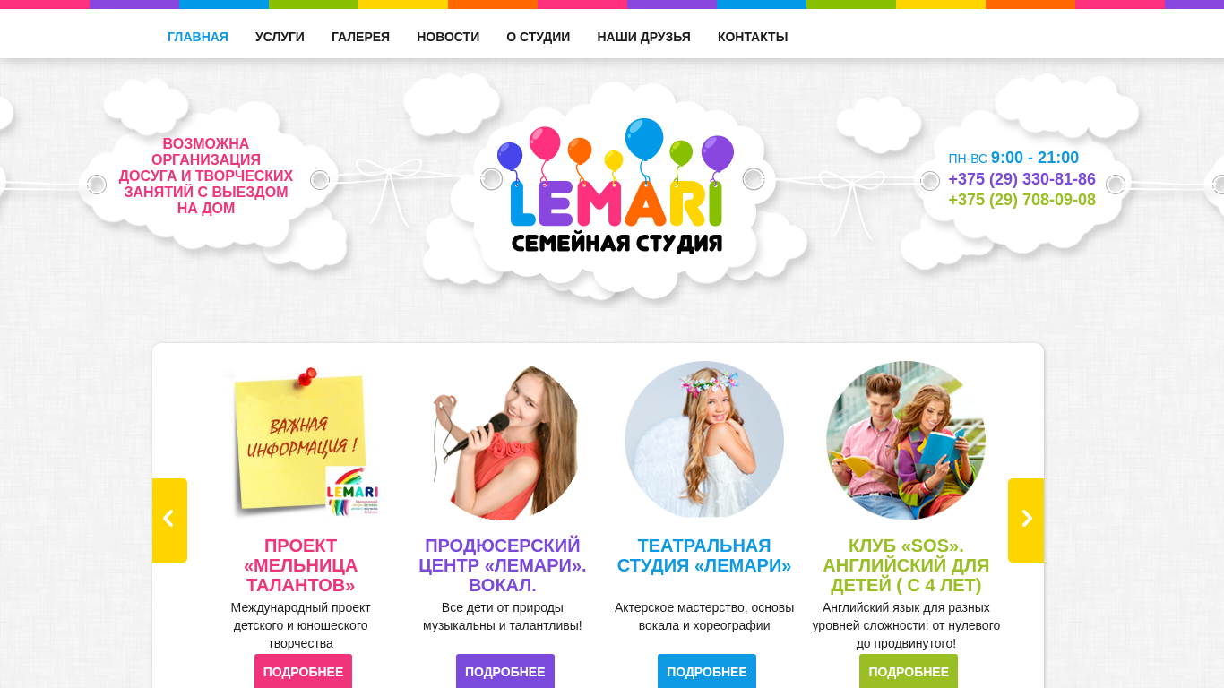 | AI-анализ | The website is for a family studio and children's center for early development and creativity called LeMari, located in Minsk, Belarus. The main services offered include a gallery, news about the studio, contacts, organization of activities and events both on-site and off-site, and a theatrical studio for acting, vocal, and choreography lessons. Additionally, there are clubs for different age groups such as a club for teenagers (14-16 years), a school studio for children (5-10 years), and a club for younger children (2-6 years). There is also a project called "Мельница Талантов" (Melnitsa Talantov), an international children and youth creativity project. The producer center "Лемари" (Lemari) offers vocal training. The website provides information on these offerings and their schedules, as well |