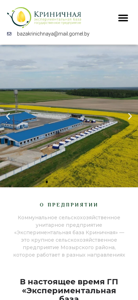 | AI-анализ | --- This online resource is dedicated to Kommunalnoe selskohozyaystvennoe uchrezhdenie "Experimental Base Krinichnaya" - a large agricultural enterprise located in Mozirsky raion. The business operates in various fields and includes: 7 dairy-livestock complexes, 7 grain farms, a corn-calibration factory, a vegetable oil production line, and a seed production line for cereals and legumes. The main areas of production are agriculture and livestock farming, seed production, and corn calibration. The website provides contact information, including an email address (bazakrinichnaya@mail.gomel.by). |