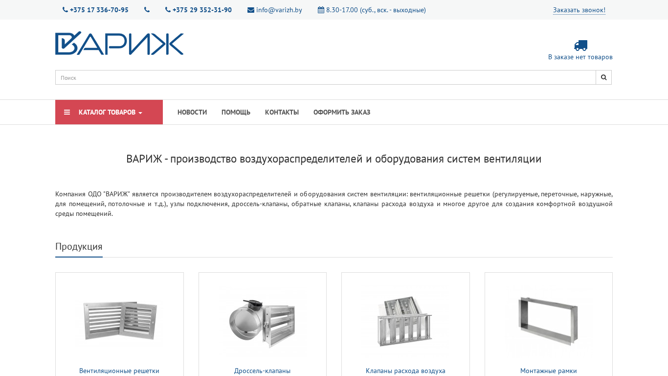 | SEO-описание | Официальный сайт производителя оборудования для систем вентиляции ВАРИЖ: решетки, узлы подключения, клапаны и тп. |