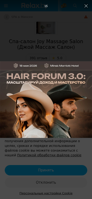 --- The website joy-salon.relax.by is a spa salon located in Minsk, Belarus, at the address Красноармейская 36. The site provides reviews, contact information including phone numbers, and operating hours. The top services offered at this spa include various types of massages, such as traditional Chinese and Thai massages, as well as other beauty services. The site also features a map for easy access. The Joy Massage Salon has received 391 reviews with an average rating of 5.0. Some reviews praise the professionalism of the massage therapists and the effectiveness of the treatments. The site is operated by Relax.by.