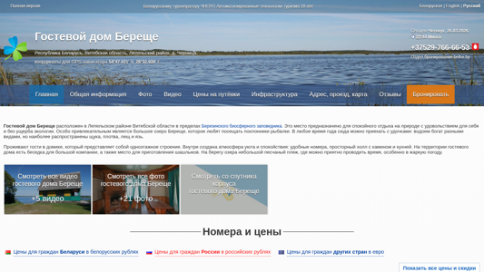| AI-анализ | The website is for a guest house named Береще, located in the Lepeльsky district of the Vitebsk region in Belarus. It is situated within the Berezinsky Biosphere Reserve and offers a peaceful retreat in nature without harming the environment. The main attraction is the large lake Береще, popular among fishing enthusiasts. The lake is abundant with various fish species, including щука, плотва, лещ, and язь. Guests reside in a one-story cottage, featuring comfortable rooms, a spacious hall with a fireplace and kitchen, a gazebo for large groups, and a place for barbecue. The house also has a small pebbled beach on the lake shore, perfect for enjoying sunny weather. Video and photo content are available for viewing. Prices for Belarusian citizens, Russians, and other foreigners are listed in |