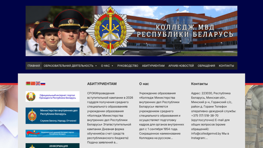 | AI-анализ | --- The web project "УО "Колледж МВД Республики Беларусь" (colledgemvd.by) is a educational institution website dedicated to the College of the Ministry of Internal Affairs of Belarus. The site provides information on various educational programs, including humanitarian, civil-legal, administrative and criminal law, technical, and specialized disciplines. It also offers courses for improving qualifications for both new recruits and existing staff. The site mentions recent events such as the recruitment of new students, the conclusion of the previous academic year, and the graduation ceremony for new law enforcement officers. The site also includes sections on the conditions of study and living, the history of the institution, and various social organizations. The site's top keywords include "cycle," "preparation," "2026," "disciplines," "mvd," and "training." |