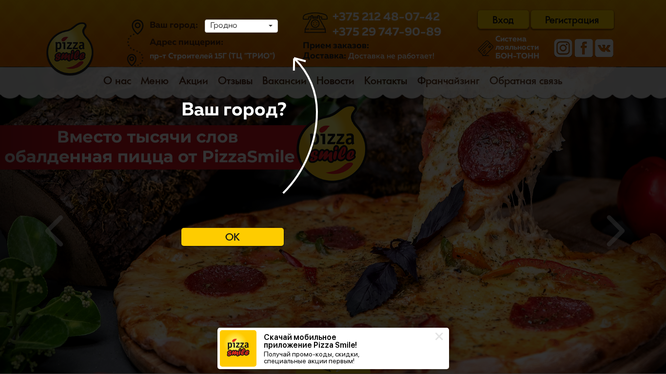 | AI-анализ | This online resource belongs to Pizza Smile, a pizza restaurant chain operating throughout Belarus. The website offers the opportunity to order pizza for takeout using the mobile application Pizzasmile. The title and description of the website emphasize this functionality. The top words indicate that the words 'very' and 'thank you' appear frequently, as well as references to pizza, smile, delivery, and the city of Grodno. The menu includes pizzas, sushi, starters, soups, hot dishes, pasta, grilled items, salads, desserts, and bar items. The website also features a loyalty program, flexible delivery options, a children's menu, photo testimonials, job openings, news, and contact information. The restaurant chain aims to provide a convenient location, diverse menu, loyalty program, and flexible delivery. The website is for the city of Grodno, |