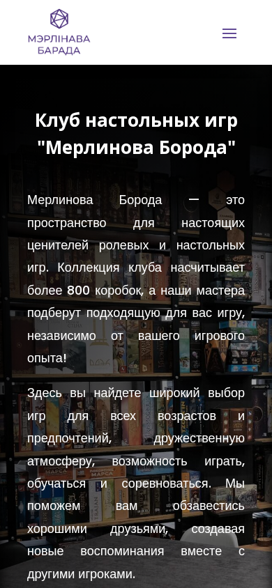 | SEO-описание | Клуб настольных игр Мерлинова Борода в Минске. Рады видеть всех и каждого. Большой выбор игр любой сложности, где Вам всегда подскажут и помогут с правилами. |