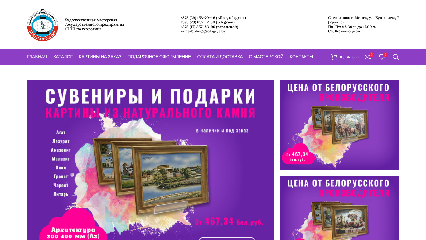 | AI-анализ | This website is an art studio and center of geology, offering custom-made paintings from natural stone and other services. The artists work by the client's chosen themes. The phone numbers for contact are +375 (29) 153-70-46, +375 (29) 637-72-30, and +375 (17) 357-83-99. The email addresses are aho@geologiya.by and market@geologiya.by. The studio is located in Minsk, Ul. Kuprevich, 7 (Uruchje). The opening hours are Monday to Friday from 8.30 am to 5.00 pm and Saturday, Sunday: closed. The studio can be reached by calling the numbers or emailing. The catalog includes various categories such |