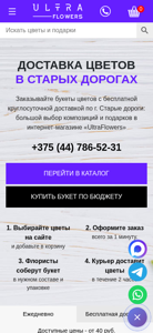| AI-анализ | Этот сайт — онлайн-магазин цветов под названием "Ультра Цветы" с бесплатной и круглосуточной доставкой в город Старые Дороги в Беларуси. В магазине предлагается разнообразные букеты по доступным ценам, начиная от 5 рублей за цветок. Покупателям также предоставляется возможность получения скидок, получение фотографии букета перед его отправкой и выбор из широкого ассортимента букетов. Магазин доставляет цветы по всей Беларуси и может быть контактирован по телефонному номеру +375 (44) 786-52-31 или электронной почте info@ultraflowers.by. Сайт включает в себя поиск для клиентов, позволяющий найти желаемый город, и список городов, где работает магазин. Ассортимент магазина включает букеты с розами, гвоздиками, тюльпанами, хризантемами, ирисами. |