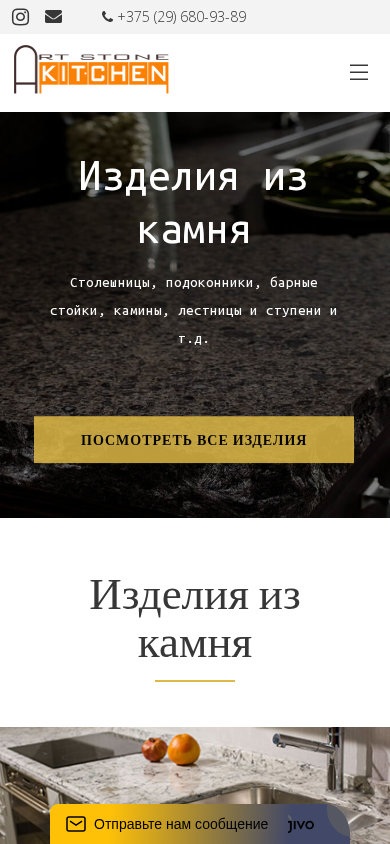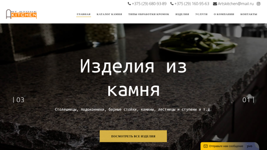 Этот сайт представляет собой онлайн-каталог различных изделий из камня, включая столешницы, облицовочные камни, камины, прилавки для встречи, стены, полы и лестницы. Сайт предлагает услуги по проектированию и визуализации из камня, а также по шлифовке и восстановлению камня. Также на сайте есть раздел для заказа индивидуально изготовленных кухонь от производителя в Минске. Название сайта "Главная", и он включает контактную информацию компании, которая доступна по телефонам +375 (29) 680-93-89 и +375 (29) 160-95-63, или по электронной почте Artskitchen@mail.ru. Ключевые слова сайта: "камня", "услуги" и "изделия", с "камня" встречается чаще всего.
