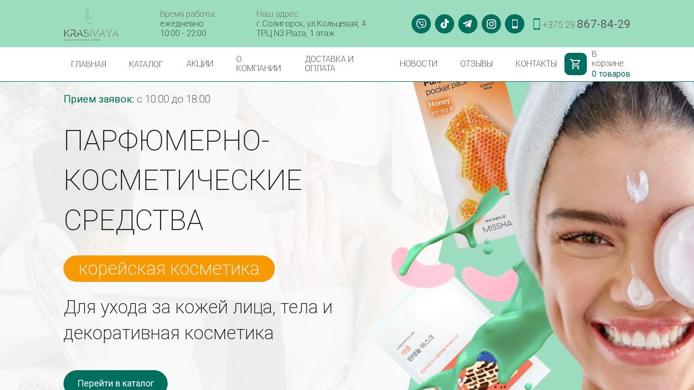 | AI-анализ | The website is a catalog for Korean skincare and body products, offering solutions for facial and body care, cleansing, toners, essences, creams, masks, patches, and SPF. The website allows users to select products based on skin type and care needs. The catalog is located in Soligorsk, Belarus, and can be reached daily from 10:00 to 22:00. The address is given as City of Soligorsk, Circle Road, 4, N3 Plaza, 1st floor. The contact number is +375 29 867-84-29. The website sells various perfume-cosmetic products, including skincare for the face and body, and decorative cosmetics. Brands and best sellers are featured in the catalog. Products listed include hydrophilic cle |